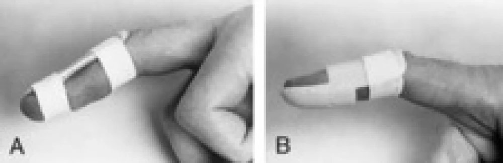 Types of splints used to treat mallet finger. A, Dorsal aluminum splint. B, Commercial splint.